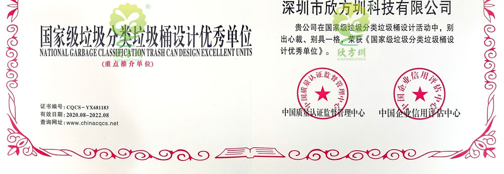 欣方圳擁有數十款國家知識產權垃圾桶專利證書,專利產品囊括不銹鋼、鋼板、玻璃鋼等市場主流垃圾桶應用材質,專業生產廠家給客戶更多選擇空間。