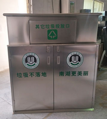 環衛不銹鋼資源回收箱1個其它垃圾投放口,正面開門,帶插銷和鎖保障內桶不被破壞,采用大容量手推垃圾車做內桶回收垃圾,可直接上掛車垃圾清運更便捷。