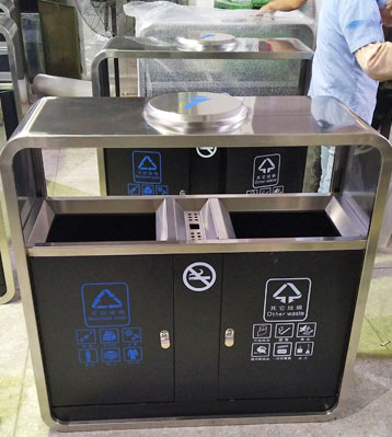 廣州市政戶外不銹鋼烤漆分類垃圾桶門板不銹鋼黑色烤漆更防銹,配置模壓玻璃鋼內桶,耐腐蝕不生銹適合長期戶外擺放經久耐用。