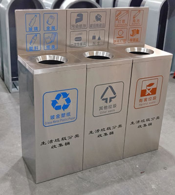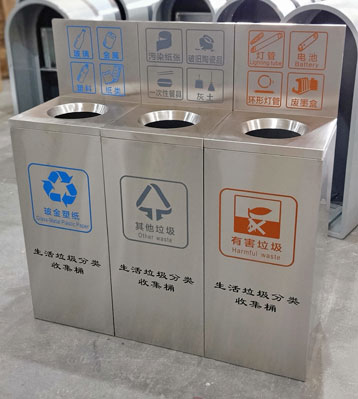 • 產品材質:不銹鋼生活垃圾分類收集桶采用201#,202#,304#優質不銹鋼材料模壓成型,堅固耐用,不易破損;耐火安全,抗高低溫,適合各種惡劣氣候條件;金屬亮澤,高雅美觀,廣泛適用于各種場所;內外表面光潔,減少垃圾殘留,易于清潔;配置鍍鋅板內桶,便于垃圾清倒;