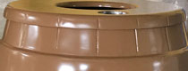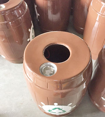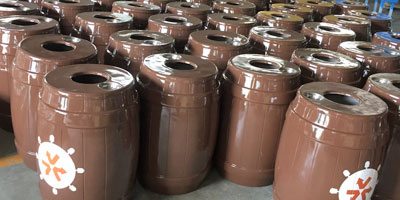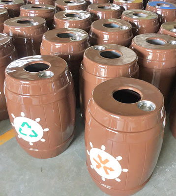 經(jīng)打磨、除塵、噴漆等一系列后期工藝然后出成品,表面光滑平整,仿木效果逼真,內(nèi)桶也采用玻璃鋼材質(zhì)制作,長期擺放于景區(qū)戶外抗老化更耐用,可單獨(dú)使用,也可多個(gè)組合擺放做分類垃圾桶!