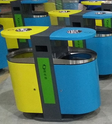不銹鋼戶外果皮箱整體采用優質不銹鋼材質制作,立柱做深灰、分類桶身做黃藍烤漆工藝多層防銹更耐用,投口為不銹鋼本色,巧妙利用立柱空間做廢舊電池分類收集。