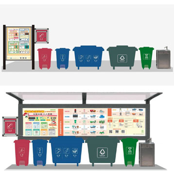 設有擋雨棚,可配備垃圾箱信息顯示屏、防水照明燈、廣告屏,進行地面硬化。對社區玻金塑紙可回收物,其他垃圾,廚余垃圾,有害垃圾等生活垃圾定時定點投放收集.