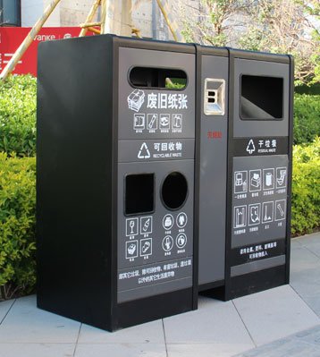 采用金屬材質表面烤漆工藝防銹處理,可回收物和其他垃圾2大分類設計,細分廢舊紙張、塑料、玻璃瓶可回收物多分類收集,投口膠條封邊防毛刺利口傷手。